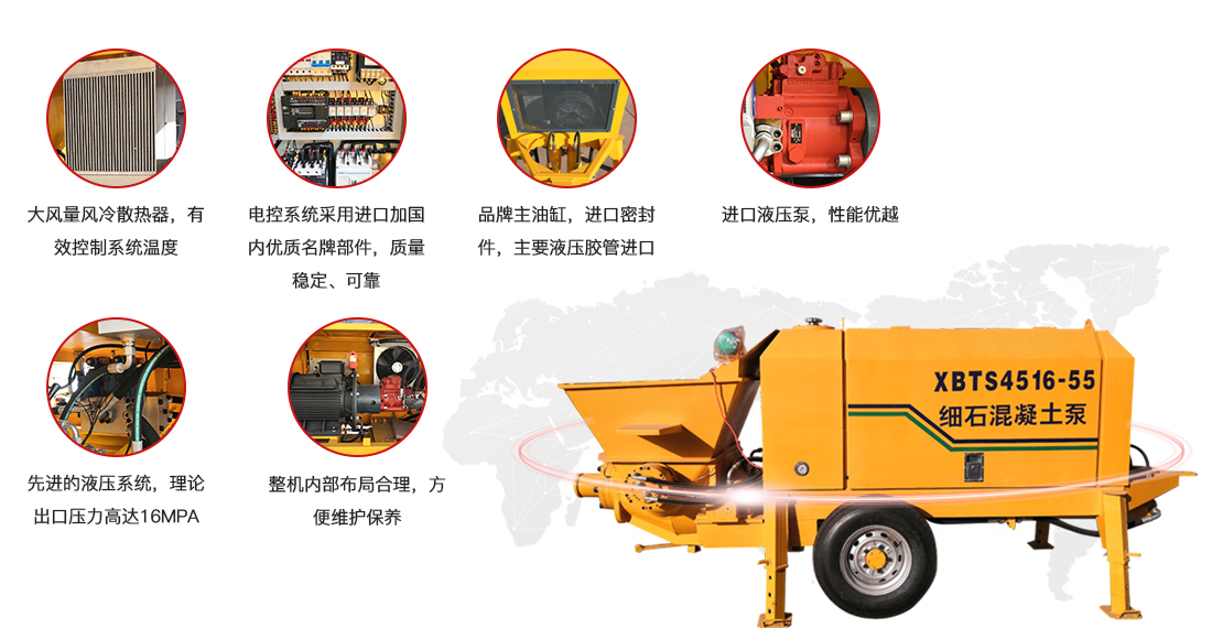 2018年我公司經過近10年的技術積累和市場調研又陸續(xù)開發(fā)了XBTS50-55細石混凝土兩用泵和XBTS4516-55高壓細石混凝土泵兩款新產品,XBTS50-55既可以泵送標準混凝土又可以泵送細石混凝土,特別適合地下車庫及大面積地面施工,施工效率高,XBTS4516-55高壓細石混凝土泵理論出口壓力達到16Mpa,主要面向超高樓層的細石混凝土泵送,泵送高度可達200米。